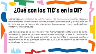 Este documento describe las Tecnologías de la Información y la Comunicación (TIC's) y su importancia para la educación de personas con discapacidad intelectual. Explica que las TIC's brindan herramientas educativas de fácil acceso como aplicaciones móviles y software diseñados para apoyar el aprendizaje. También menciona algunas aplicaciones y programas específicos diseñados para personas con discapacidad intelectual.