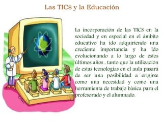 El documento destaca la creciente importancia de las tecnologías de la información y la comunicación (TIC) en la educación, subrayando su papel crucial para mejorar el aprendizaje y la participación familiar. A pesar de sus beneficios, señala los riesgos de una falta de preparación docente y la resistencia al cambio en métodos educativos tradicionales. Se enfatiza la necesidad de que todos los agentes educativos se adapten a la presencia masiva de los estudiantes en internet.