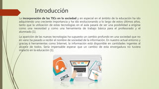 Este documento describe los beneficios de incorporar las TIC (tecnologías de la información y comunicación) en la educación. Explica que las TIC han adquirido importancia en la sociedad y la educación, permitiendo el acceso a grandes cantidades de información. También detalla varias ventajas de las TIC en el aula como la evaluación personalizada, retroalimentación instantánea, mejor comunicación, y liberación de tareas rutinarias para los profesores. Finalmente, resalta ejemplos del impacto positivo de las TIC en la educación