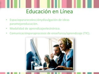 Este documento describe el uso de las TIC (tecnologías de la información y comunicación) en la educación en línea. Explica las características, ventajas y desventajas de la educación en línea, así como los retos en este campo. Luego detalla algunas TIC clave utilizadas, como las telecomunicaciones, la telefonía celular, las redes de computadoras y la videoconferencia. El documento concluye resaltando la importancia de las TIC en la sociedad actual y su integración en los procesos de enseñanza