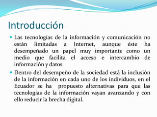 Las tecnologías de la información y comunicación (TIC) son herramientas valiosas para la educación que pueden reducir la brecha digital. Las TIC permiten el acceso a información, la comunicación y su uso didáctico facilita los procesos de enseñanza y aprendizaje. Si se implementan y usan bien las TIC en Ecuador, se puede reducir paulatinamente la brecha digital y promover una sociedad más inclusiva de la información.