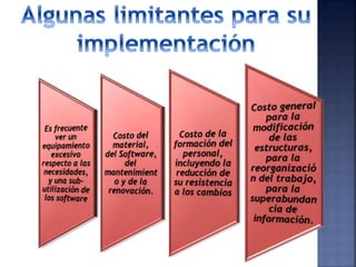 El documento habla sobre las tecnologías de la información y la comunicación (TIC) y cómo estas permiten a las empresas acceder fácilmente a grandes cantidades de información de manera más accesible y económica. También describe la e-logística como la logística en un entorno de e-business que implica el uso de Internet en los procesos empresariales como la producción, logística, finanzas y comercio. Finalmente, resume los pasos del proceso de e-logística desde que un cliente compra un producto en lí