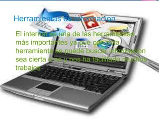El documento define varias herramientas de información y comunicación comunes en Internet. Las herramientas de información incluyen Internet para buscar datos y la World Wide Web como un sistema de distribución de información enlazada. Las herramientas de comunicación mencionadas son las redes sociales, el correo electrónico y el mensajero. También define términos como página web, buscador, navegador y foros.