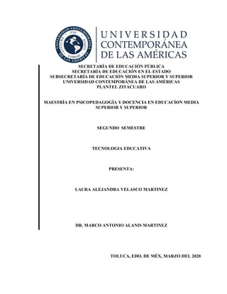 Este documento trata sobre el uso de las tecnologías de la información y comunicación (TIC) en la educación. Define la tecnología educativa y describe algunas de sus características y tendencias actuales como el flipped classroom, Moocs, aplicaciones móviles, tablet computing, aprendizaje basado en juegos, realidad aumentada y mobile learning. Explica las ventajas y desventajas del uso de las TIC en la educación. El objetivo es mejorar la práctica docente y generar aprendizajes atractivos e impactantes para los estudiant