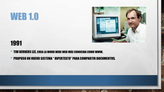 La Web 1.0 fue creada en 1991 por Tim Berners-Lee como un sistema hipertextual para compartir documentos entre investigadores. Consistía en páginas estáticas con pocos productores y muchos lectores de contenido. La Web 2.0 surgió en 2004 aprovechando las nuevas tecnologías para crear una web social donde los usuarios comparten y crean contenido de forma colaborativa.
