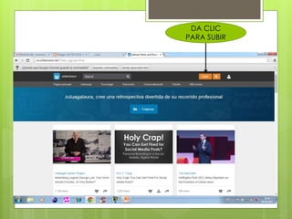 SlideShare es una herramienta para compartir presentaciones y documentos. Se puede subir un archivo haciendo clic en "Subir" o seleccionando el archivo a cargar desde el explorador. Una vez seleccionado el archivo, este se cargará para ser compartido en la plataforma.