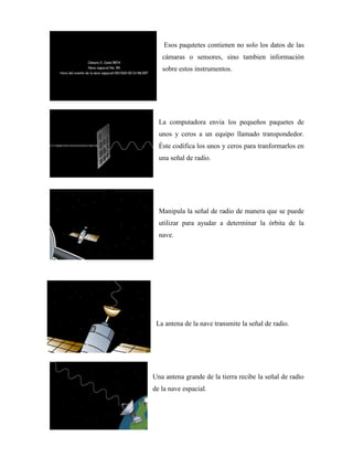 Una nave espacial puede enviar información y fotografías de regreso a la Tierra usando un transpondedor de banda X. Los instrumentos de la nave recogen datos como fotografías, los cuales son convertidos a paquetes de unos y ceros por la computadora de la nave. Estos paquetes son enviados al transpondedor, el cual codifica la señal de radio para ser transmitida a la Tierra, donde es recibida y descodificada para reconstruir los datos originales.