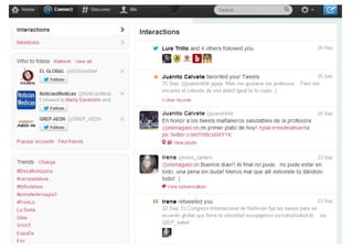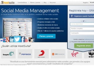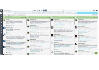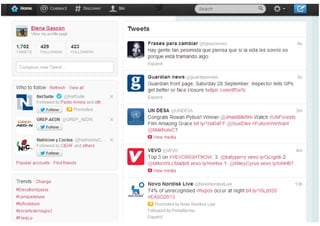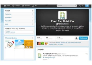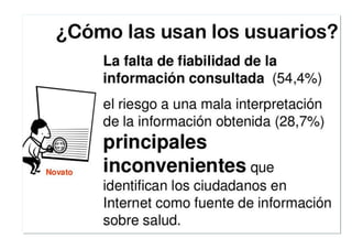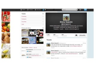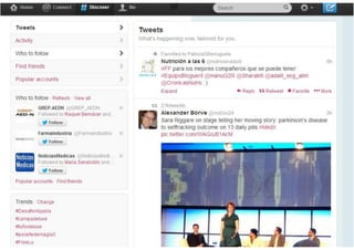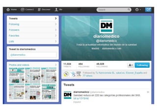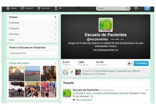 El documento describe las herramientas de las Tecnologías de la Información y la Comunicación (TIC) que los profesionales sanitarios pueden utilizar para comunicarse con pacientes, como blogs, redes sociales como Facebook y Twitter, y plataformas de video como YouTube. Explica cómo usar estas herramientas para compartir información sobre salud de forma masiva y facilitar el intercambio de opiniones entre profesionales, y enfatiza la importancia de escuchar a los pacientes y mantener las cuentas actualizadas.