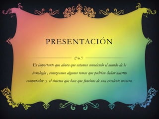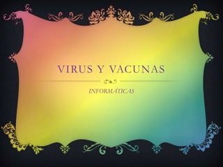 Este documento habla sobre virus informáticos y vacunas. Explica que los virus son programas que se reproducen e interfieren con computadoras o sistemas operativos. Detalla varias estrategias de infección usadas por los virus como añadidura, inserción y sustitución. También clasifica los virus por su destino de infección y acciones. Finalmente, ofrece consejos sobre cómo detectar virus, el uso de antivirus y medidas de protección.