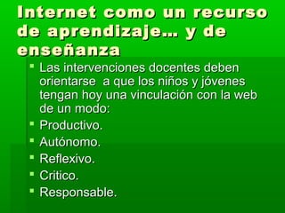 El documento describe los recursos de Internet que pueden utilizarse en el aula para que los estudiantes usen la web de manera productiva, autónoma, reflexiva, crítica y responsable. Describe estrategias como los webquest y miniquest que permiten resolver desafíos colaborativamente. También enumera varios sitios web, herramientas y actividades educativas que pueden usarse y los beneficios de hacerlo, como obtener recursos, comunicarse y desarrollar proyectos colaborativos.