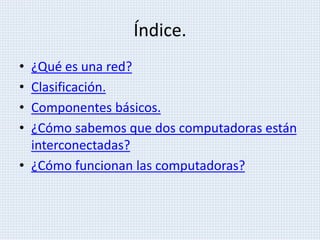 Este documento proporciona una introducción a las redes de computadoras. Define una red como un sistema de comunicaciones que conecta varias unidades y permite el intercambio de información. Clasifica las redes según su cobertura, tipología y relación funcional. Describe los componentes básicos de una red como computadoras, periféricos, placas de red, modems y cables de conexión. Explica que dos computadoras están interconectadas si pueden intercambiar información a través de dispositivos físicos, y que el propósito principal