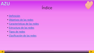 Este documento define una red informática y clasifica los diferentes tipos de redes. Explica que una red es un conjunto de computadoras interconectadas que comparten información y recursos. Luego describe las características principales de las redes, incluyendo su estructura de tres niveles y los diferentes tipos de redes clasificadas por su alcance, como las redes de área local, metropolitana y amplia.