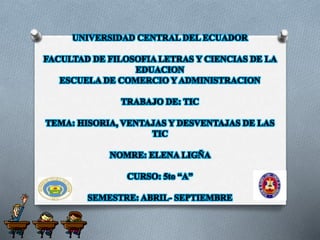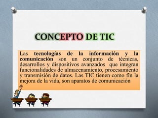 Las tecnologías de la información y la comunicación (TIC) son un conjunto de técnicas y dispositivos avanzados que integran funcionalidades de almacenamiento, procesamiento y transmisión de datos con el fin de mejorar la vida. La historia de las TIC comenzó en la década de 1960 y ha experimentado un rápido crecimiento desde la década de 1980 debido a innovaciones como Internet. Actualmente, las TIC juegan un papel integral en las organizaciones modernas y se espera que transformen aún más la educación.