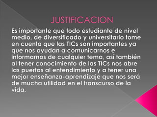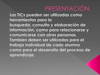 El documento describe los objetivos y actividades de un proyecto para conocer y utilizar las tecnologías de la información y comunicación (TICs) en la educación. El objetivo general es conocer ampliamente las TICs tomando en cuenta que se requiere tiempo e interés, mientras que el objetivo específico es utilizar las TICs adecuadamente para mejorar la calidad educativa. Las actividades incluyen investigar temas usando recursos humanos e Internet, investigar palabras usando recursos humanos y computadora, y presentar un trabajo con diapositivas.