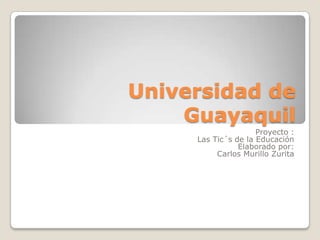 Este documento propone un plan de capacitación en TIC para docentes de la Universidad de Guayaquil para mejorar la calidad de la educación. El plan busca desarrollar competencias de uso de TIC en los docentes a través de aprendizaje electrónico para incorporar recursos innovadores en la enseñanza.