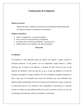 Este documento presenta información sobre la construcción de hipótesis en investigación. Define una hipótesis como una suposición que podría o no ser comprobada. Explica las características, variables e importancia de las hipótesis, así como cómo se formulan y los tipos de hipótesis. El objetivo es ayudar a los estudiantes a entender el proceso de generar hipótesis válidas para guiar la investigación científica.