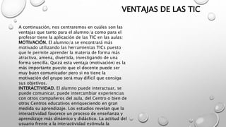 El documento discute el papel creciente de las tecnologías de la información y la comunicación (TIC) en la educación. Señala que las TIC son cada vez más importantes en la sociedad y que la educación debe adaptarse e integrar las TIC en los procesos de enseñanza-aprendizaje y la gestión de las escuelas para mejorar la calidad de la enseñanza. También destaca algunas ventajas de las TIC para los estudiantes y maestros como la motivación, la interactividad y la cooperación.
