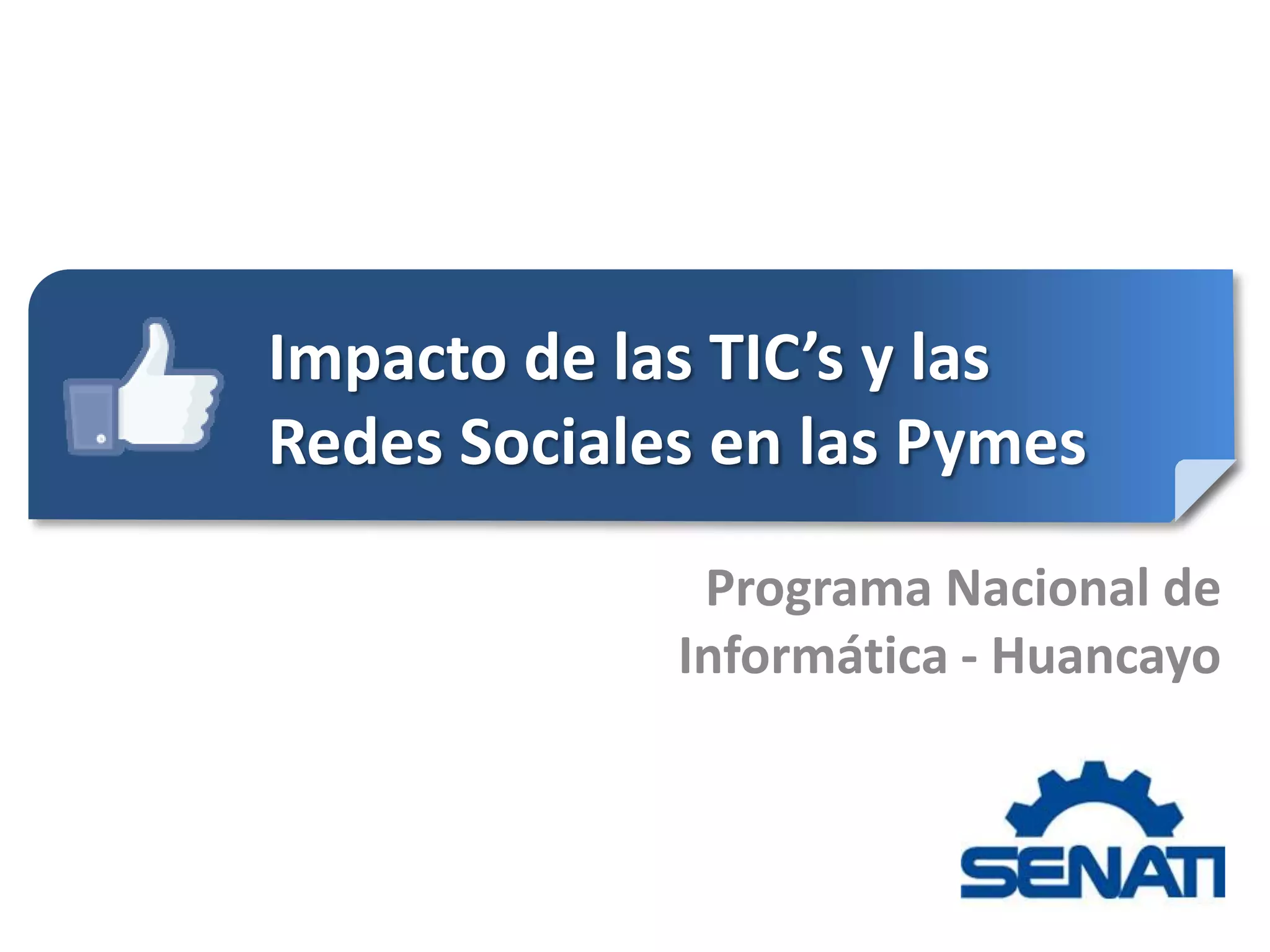 El documento describe el impacto de las tecnologías de la información y comunicación (TIC's) y las redes sociales en las pequeñas y medianas empresas (pymes) en Perú. Explica que las redes sociales como Facebook y Twitter son importantes para dar a conocer una empresa y que el 15-25% de empresas en Perú usan estas plataformas. También destaca que las pymes pueden aprovechar las oportunidades en internet para posicionarse, vender productos y servicios, y crear páginas web, blogs y perfiles en redes sociales para prom