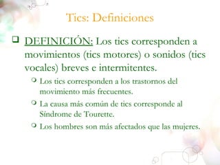 El documento describe los tics, definidos como movimientos o sonidos breves e intermitentes. Explica que los tics motores pueden ser simples o complejos, e incluyen movimientos de diferentes partes del cuerpo. Los tics vocales también pueden ser simples o complejos, e incluyen sonidos y palabras. El Síndrome de Tourette se presenta como la causa más común de tics, caracterizado por múltiples tics y trastornos de comportamiento asociados.