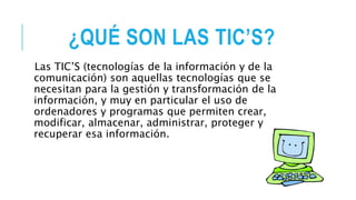 El documento define las TIC (tecnologías de la información y comunicación) como tecnologías necesarias para gestionar y transformar información, especialmente mediante el uso de ordenadores y programas. Define las TAC como el uso orientado de las TIC hacia aplicaciones educativas para estudiantes y profesores con el objetivo de aprender mejor, incidiendo en la metodología y usos didácticos de la tecnología para el aprendizaje y la enseñanza, más allá de simplemente aprender a usar las herramientas tecnológicas