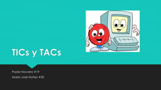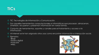 El documento describe las Tecnologías de la Información y la Comunicación (TICs) y las Tecnologías del Aprendizaje y el Conocimiento (TACs). Las TICs son herramientas como blogs, pizarras digitales y podcasts que procesan y presentan información. Las TACs van más allá del aprendizaje de la tecnología y buscan adquirir conocimiento a través de herramientas informáticas. Ambas tienen ventajas como la promoción y el aprendizaje a distancia, pero también desventajas