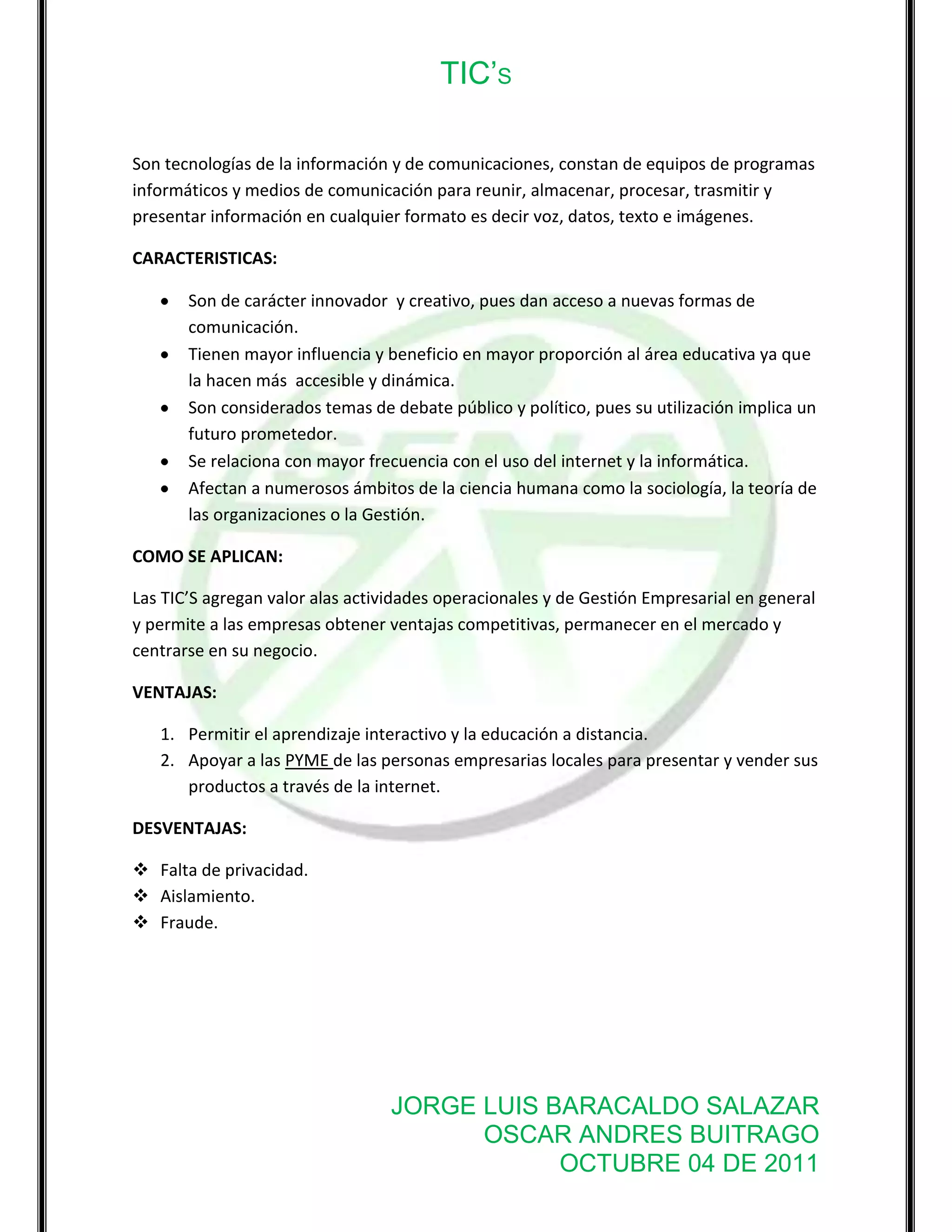 Las TIC son tecnologías que permiten reunir, almacenar, procesar y transmitir información en cualquier formato. Son innovadoras y creativas, y tienen gran influencia en el área educativa. Permiten agregar valor a las empresas y obtener ventajas competitivas. Algunas ventajas son permitir el aprendizaje a distancia y apoyar a las PYME, aunque también tienen desventajas como falta de privacidad y aislamiento.