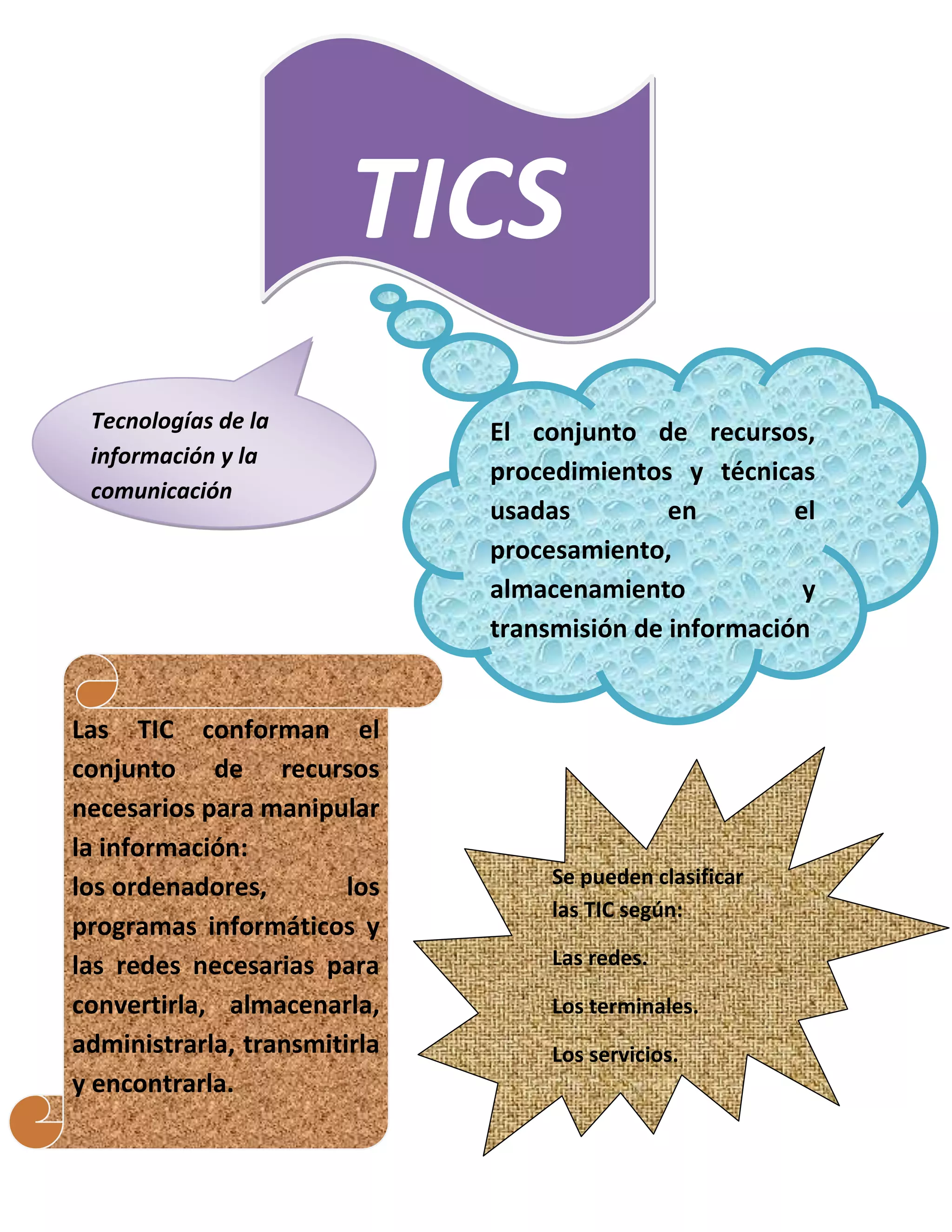 Las Tecnologías de la Información y la Comunicación (TIC) son el conjunto de recursos necesarios para manipular la información, incluyendo ordenadores, programas informáticos y redes que permiten convertir, almacenar, administrar, transmitir e identificar la información. Las TIC pueden clasificarse según las redes, los terminales o los servicios utilizados en el procesamiento, almacenamiento y transmisión de información.
