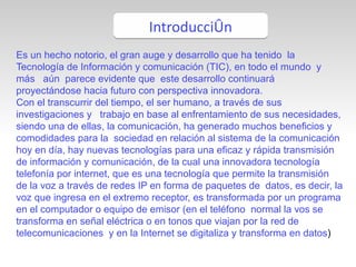 Este documento resume la evolución y el estado actual de las tecnologías de la información y la comunicación (TIC). Explica que las TIC han experimentado un gran desarrollo a nivel mundial impulsado por inventos clave como los primeros ordenadores, los circuitos integrados, Internet y los satélites de comunicación. También anticipa que en el futuro las TIC seguirán evolucionando hacia sistemas más portátiles, pantallas planas, tecnologías inalámbricas y un uso generalizado de Internet de alta velocidad.