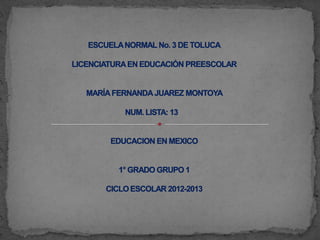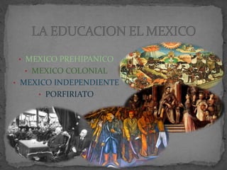 La educación prehispánica se centraba en el culto religioso y las niñas aprendían labores domésticas. En la época colonial, los misioneros como Pedro de Gante fundaron las primeras escuelas para enseñar a indígenas. Durante la época de independencia, la educación buscaba formar ciudadanos útiles para el estado usando métodos como la enseñanza mutua. El porfiriato criticó la rigidez del sistema educativo y prefería una educación práctica e integral.
