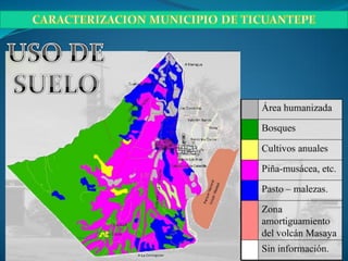 El documento describe un proyecto de parque industrial en Ticuantepe que incluye una planta empacadora de piña y plátano, así como una planta procesadora de frijol. Se analiza el potencial agroindustrial del municipio, especialmente para la piña, y se proponen acciones para mejorar la producción y comercialización de este cultivo. También se incluye información sobre la ubicación, población, economía y organización territorial de Ticuantepe.