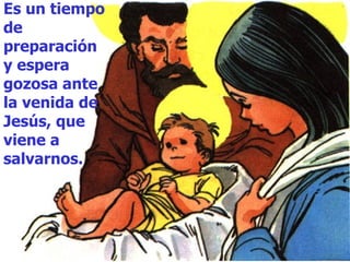 El Adviento es un periodo de 4 semanas antes de Navidad para prepararse espiritualmente para la venida de Jesús a través de la oración, la conversión y encendiendo una vela más cada semana; los profetas anunciaron que Jesús nacería en Belén de una virgen para salvarnos como el Mesías prometido.