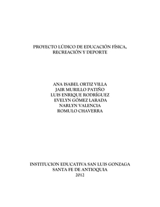 Este documento presenta un proyecto de educación física, recreación y deporte en una institución educativa en Colombia. Describe la situación actual de los estudiantes, la institución y la comunidad, incluyendo falta de interés en el aprendizaje, sedentarismo y poco uso del tiempo libre. El proyecto busca mejorar la calidad de vida de los estudiantes a través de actividades deportivas, recreativas y creativas que promuevan valores, hábitos saludables y desarrollo integral. Se basa en marcos teóricos de educ