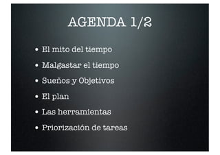 Este documento presenta ideas para mejorar la administración del tiempo, incluyendo reconocer el mito de que el tiempo se puede cambiar o estirar, identificar actividades que roban tiempo, establecer objetivos claros, implementar un plan con herramientas de gestión de tiempo, priorizar tareas, delegar responsabilidades, crear rutinas, establecer límites de tiempo para tareas, organizar sistemas de archivos y no malgastar tiempo esperando. El objetivo general es que las personas tengan mayor control sobre su tiempo para lograr sus metas de manera más productiva.
