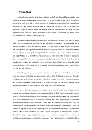El documento analiza la película 'Tiempos Modernos' de Charles Chaplin, destacando su crítica a la alienación y la crisis socioeconómica durante la Gran Depresión. A través de un análisis narrativo y temático, se exploran los personajes y los mensajes que mantienen su pertinencia en la actualidad. La obra, considerada un clásico del cine mudo, refleja no solo la resistencia al sistema capitalista, sino también una crítica a la evolución del cine en su época.
