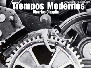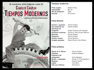Este documento resume las 15 secuencias más importantes de la película Tiempos Modernos de Charles Chaplin. La película sigue a Charlot y una vagabunda mientras pasan por varias dificultades como trabajar en una fábrica, ser arrestados, buscar trabajo y huir de la policía. El documento propone escribir un ensayo de una página analizando críticamente los hechos narrados en la película y usando sus símbolos para ejemplificar los temas que trata.