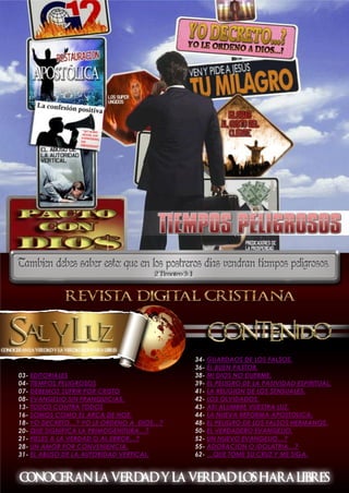 El documento habla sobre tiempos peligrosos en la iglesia, donde habrá falsos maestros y doctrinas erróneas que engañarán a muchos. Advierte que en la actualidad se predican mensajes enfocados en las necesidades humanas en lugar de la palabra de Dios, y como resultado muchos se han alejado de la verdadera fe. Exhorta a los creyentes a evaluar críticamente lo que se enseña en sus iglesias y asegurarse de que sea consistente con las Escrituras, huir de lugares donde se promue