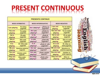 Este documento presenta un resumen de los tiempos verbales en inglés realizado por 7 maestrantes y su profesora para la Universidad Pedagógica Experimental Libertador de Venezuela. Se describen el presente continuo, pasado continuo, presente perfecto, futuro simple y otros tiempos verbales en inglés con ejemplos y explicaciones de su estructura y uso.