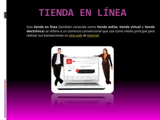El documento describe una tienda virtual como un comercio en línea que utiliza un sitio web para realizar transacciones. Las tiendas virtuales permiten a los clientes ver imágenes y especificaciones de productos y comprarlos de forma rápida y conveniente desde cualquier lugar. La mayoría requieren crear una cuenta con datos personales y los pagos se realizan típicamente con tarjeta de crédito.