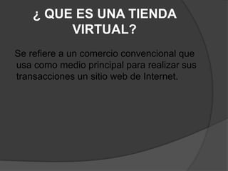 Una tienda virtual es un comercio convencional que realiza transacciones a través de un sitio web. El equivalente del local físico es un conjunto de páginas web alojadas en un servidor web, el cual debe elegirse cuidadosamente. Las tiendas virtuales permiten a las empresas vender productos a miles de clientes de forma interactiva las 24 horas desde cualquier lugar con acceso a Internet.