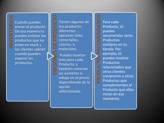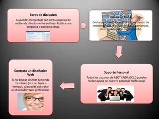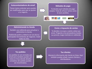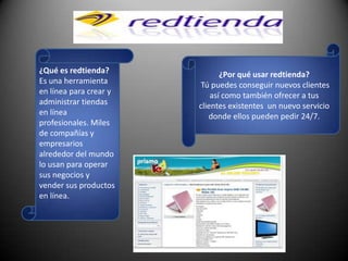 El documento proporciona información sobre Redtienda, una herramienta en línea para crear y administrar tiendas virtuales profesionales. Explica que Redtienda permite a los usuarios crear fácilmente una tienda en línea para vender sus productos las 24 horas del día. También describe las características clave como categorías de productos, páginas de productos, diseño de tienda, promociones y más. El objetivo final es ayudar a los usuarios a establecer una tienda en línea exitosa.