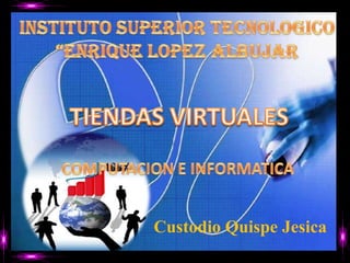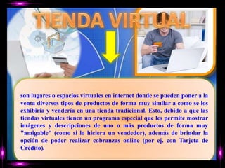 Este documento describe las tiendas virtuales, que son espacios en internet donde se pueden vender productos de forma similar a una tienda tradicional. Las tiendas virtuales permiten mostrar imágenes y descripciones de productos, así como realizar compras y cobros en línea. Entre las ventajas se incluyen que los usuarios pueden acceder en cualquier horario y que amplía el mercado potencial de los vendedores. El documento también indica que las tiendas virtuales han tenido un gran impacto en el Perú al expandir las opciones de compra y venta.