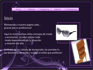 El documento presenta una página web sobre moda y accesorios. Explica la historia de la tienda Fashion Week, sus valores como la atención al cliente y la calidad. Describe eventos, promociones, consejos de moda y tendencias como los colores y diseñadores de temporada. Incluye una galería de fotos de pasarelas de moda.