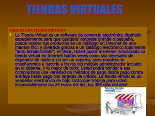Una tienda virtual es un software de comercio electrónico que permite a empresas vender sus productos en un catálogo en Internet de manera fácil y actualizable sin depender de expertos. Las tiendas virtuales permiten promocionar productos a miles de nuevos clientes de forma interactiva en su propio idioma y moneda desde cualquier lugar. Además, ofrecen soporte para pagos seguros y acceso restringido para administración y cuentas de clientes.