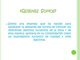 TierraTours Santander es una empresa de turismo receptivo en Santander, Colombia. Su misión es proporcionar servicios de recorridos y traslados turísticos de alta calidad a visitantes nacionales y extranjeros, explotando los recursos turísticos de la región. La empresa ofrece una variedad de servicios turísticos como recorridos, información turística y diseño de tours personalizados. Su visión es ser líder en el turismo receptivo de Santander al ofrecer altos estándares de calidad y experiencias satis