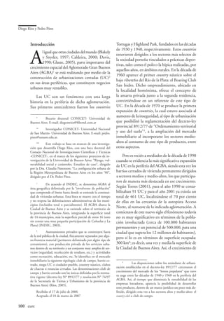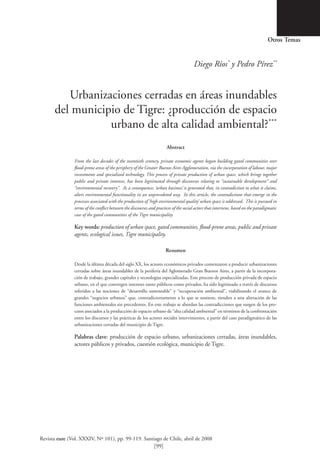El documento analiza las urbanizaciones cerradas construidas en áreas inundables del municipio de Tigre en las últimas décadas. Estas urbanizaciones han sido posibles gracias a grandes inversiones privadas y la incorporación de tecnología, a pesar de las limitaciones ambientales de la zona. Si bien se justifican bajo discursos de desarrollo sustentable, en realidad tienden a alterar las funciones ambientales de manera sin precedentes. El documento explora las contradicciones entre los discursos y las prácticas de los actores invol