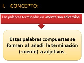 Los adverbios se forman añadiendo la terminación "-mente" a los adjetivos. Si el adjetivo es de una sola sílaba, se mantiene la forma, mientras que si tiene dos terminaciones, se antepone la variante femenina del adjetivo antes de agregar "-mente". Los adverbios generalmente indican cómo se realiza una acción. La tilde en los adverbios formados a partir de adjetivos se coloca en la misma sílaba que la llevaba el adjetivo original.