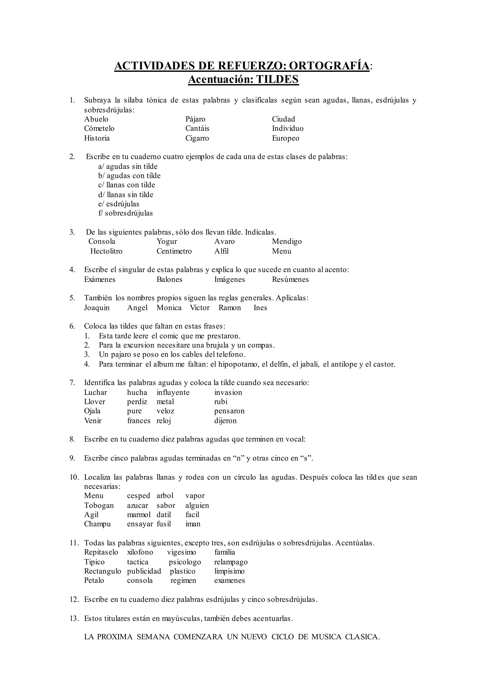 Este documento presenta una serie de actividades de refuerzo sobre ortografía y acentuación de palabras en español. Incluye ejercicios para clasificar palabras según su acento, identificar palabras agudas, llanas, esdrújulas y sobresdrújulas, y colocar tildes correctamente en palabras de diferentes categorías. También incluye la solución a los ejercicios propuestos.