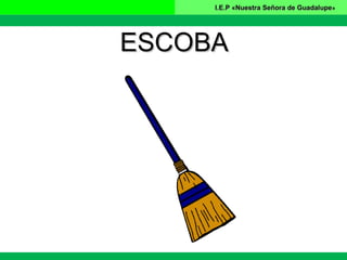 Este documento breve menciona el nombre de un instituto educativo católico llamado "Nuestra Señora de Guadalupe" y lista dos artículos relacionados con la limpieza: escoba y plumero.