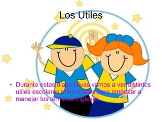 Este documento presenta una lista de términos escolares básicos en inglés y español, incluyendo utensilios como tijeras, lápiz, borrador, colores, regla, libro, pegamento, bolso, profesora y pizarra.