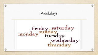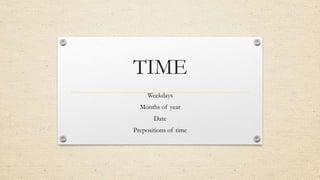 Este documento explica las formas de expresar fechas y horas en inglés. Cubre los días de la semana, meses del año, fechas, y preposiciones de tiempo como "on", "in", y "at". Las fechas en inglés siguen el formato día + ordinal del mes + mes + año. Los años se pueden leer como un número o dividiéndolos en dos partes. Las preposiciones de tiempo se usan de manera específica dependiendo si se refiere a parte del día, estación, período de tiempo, fecha, festividad, o